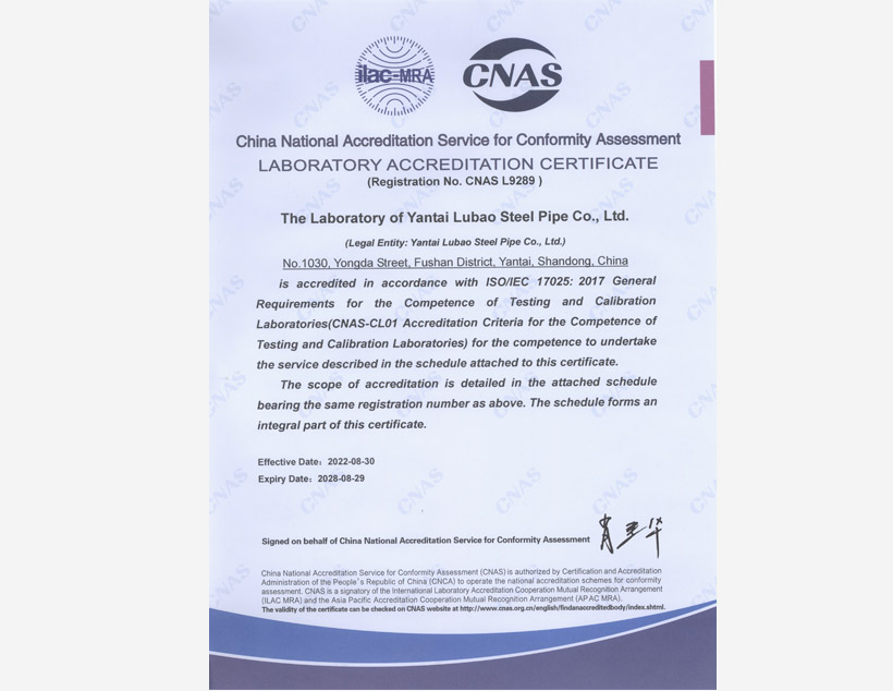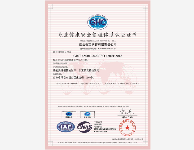 公司管理體系取得API Q1、ISO 9001、ISO 14001、ISO 45001和ISO 50001標準認證證書,實驗室取得ISO/IEC 17025認可證書。